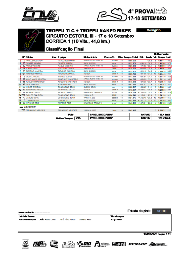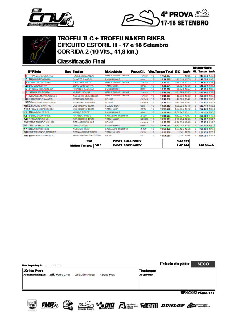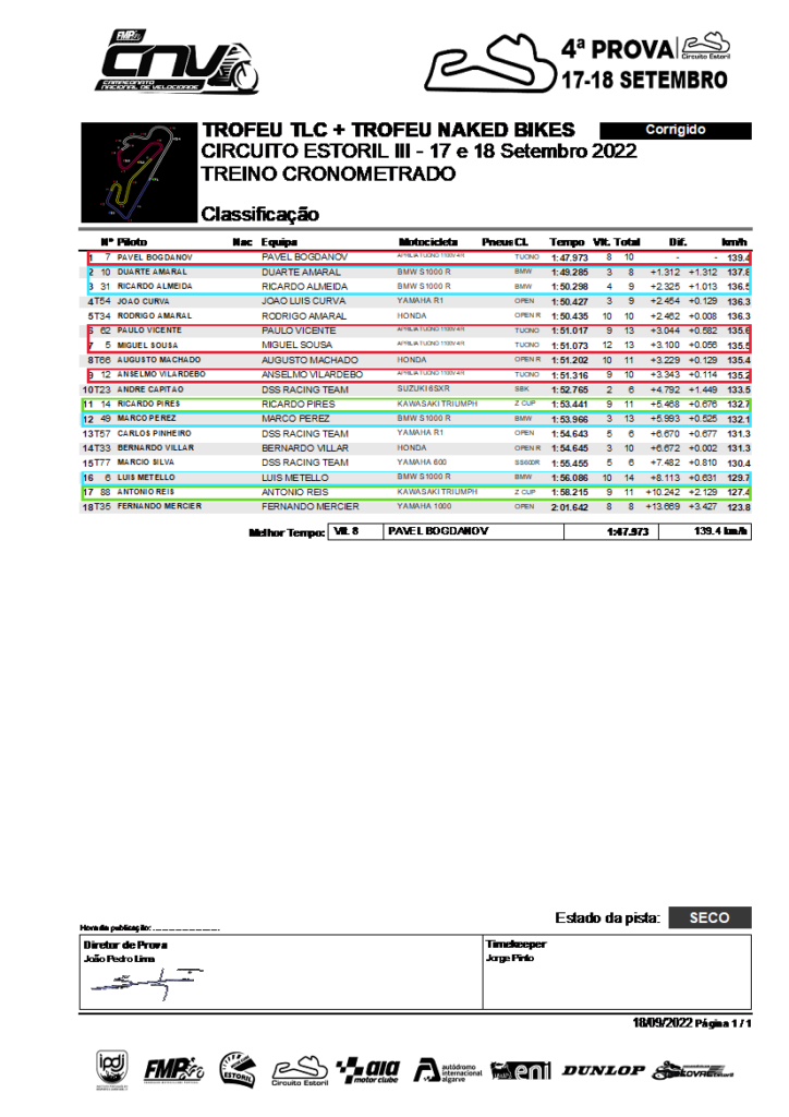 A S1000R de Perez, foi subindo na geral, tendo o piloto conseguido bater o seu record pessoal ao rodar em 1:52,283 mas sobretudo, fazendo várias voltas neste segundo. Muito bom! A melhor Z, a de Pires, sem a lebre do “francês” nem a pressão de Leal, cumpriu calendário, apesar de ter superado a S1000R de Metello e a Z de Reis que fecharam a classificação geral por esta ordem.